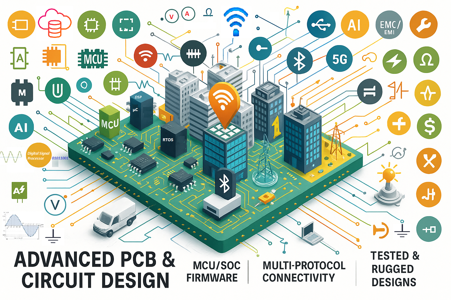 We provide advanced PCB and circuit design, covering both analog and digital systems, with expertise in high-speed and power-critical layouts.
